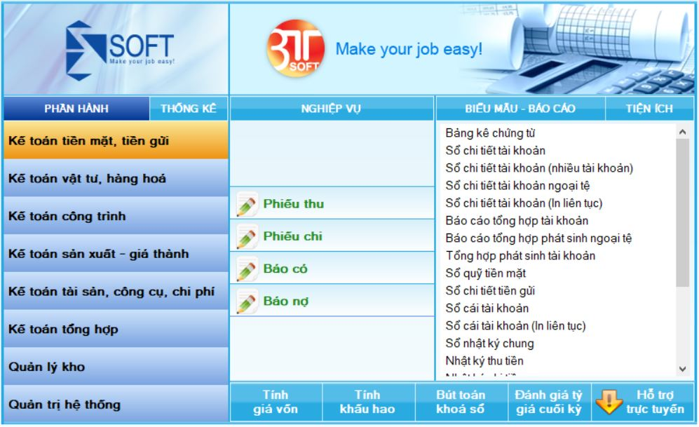 - 3TSoft tổ chức giao diện nhập liệu rõ ràng, logics từ tên phần hành đến danh sách các chứng từ nghiệp vụ thuộc phần hành đó, cột tiếp theo là danh sách các báo cáo liên quan.